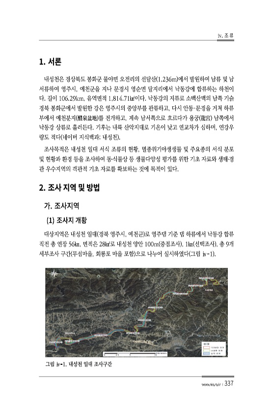 iv. 조 류 www.nie.re.kr ? 337 1. 내성천은 경상북도 봉화군 물야면 오전리의 선달산 1,236m 에서 발원하여 남류 및 남 서류하여 영주시, 예천군을 지나 문경시 영순면 달지리에서 낙동강에 합류하는 하천이 다. 길이 106.29km, 유역면적 1,814.71㎢이다. 낙동강의 지류로 소백산맥의 남쪽 기슭 경북 봉화군에서 발원한 강은 영주시의 중앙부를 관류하고, 다시 안동·문경을 거쳐 하류 부에서 예천분지 醴泉盆地 를 전개하고, 계속 남서쪽으로 흐르다가 용궁 龍宮 남쪽에서 낙동강 상류로 흘러든다. 기후는 내륙 산악지대로 기온이 낮고 연교차가 심하며, 연강우 량도 적다 네이버 지식백과; 내성천 조사목적은 내성천 일대 서식 조류의 현황, 멸종위기야생생물 및 주요종의 서식 분포 및 현황과 환경 등...