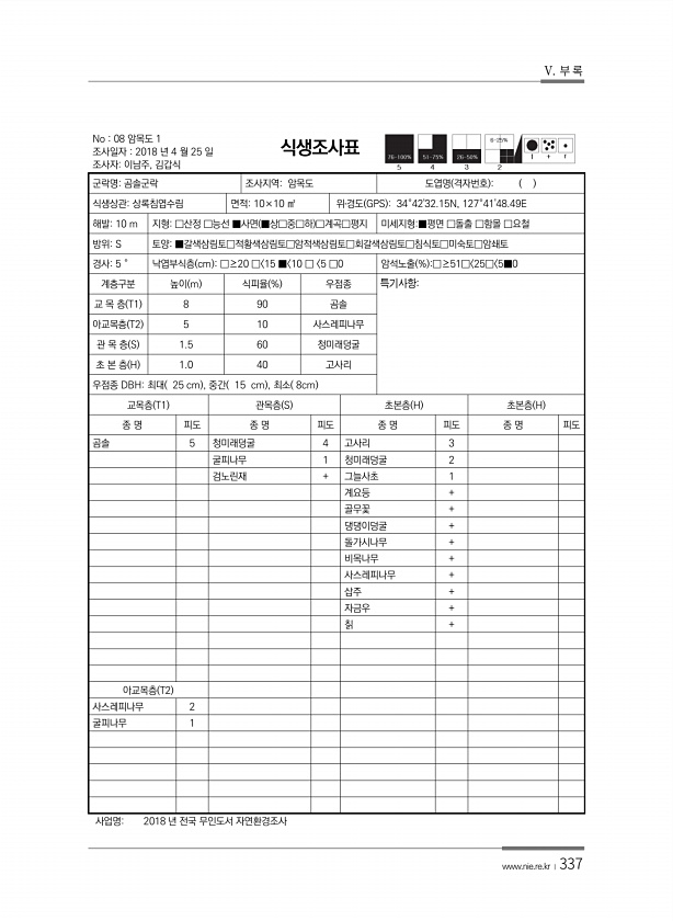 V. 부 록 www.nie.re.kr ?337 No 08 암목도 1 조사일자 2018 년 4 월 25 일 조사자이남주, 김갑식 식생조사표 군락명곰솔군락 조사지역암목도 도엽명 격자번호 식생상관상록침엽수림 면적10×10 ㎡ 위?경도 GPS 34°4232.15N, 127°4148.49E 해발10 m 지형□산정 □능선 ■사면 ■상□중□하 □계곡□평지 미세지형■평면 □돌출 □함몰 □요철 방위S 토양■갈색삼림토□적황색삼림토□암적색삼림토□회갈색삼림토□침식토□미숙토□암쇄토 경사5 ° 낙엽부식층 cm □≥20 □ 15 ■ 10 □ 5 □0 암석노출 % □≥51□ 25□ 5■0 계층구분 높이 m 식피율 % 우점종 특기사항교 목 층 T1 8 90 곰솔 아교목층 T2 5 10 사스레피나무 관 목 층 S 1.5 60 청미래덩굴 초...