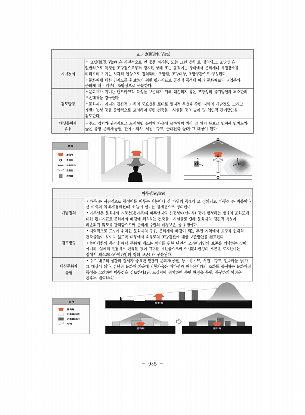 985 조망성 眺望性, View 개념정의 ? 조망 眺望, View 은 사전적으로 먼 곳을 바라봄, 또는 그런 경치 로 정의되고, 조망성 은 일반적으로 특정한 조망점으로부터 정지된 상태 또는 움직이는 상태에서 문화재나 특정장소를 바라보며 가지는 시각적 인상으로 정의되며, 조망점, 조망대상, 조망구간으로 구성된다. ?문화재에 대한 인지도를 확보하기 위한 평가지표로 공간적 특성에 따라 문화재로의 진입부와 문화재 내 ? 외부의 조망성으로 구분한다. 검토방향 ?문화재가 지니는 랜드마크적 특성을 보존하기 위해 훼손되지 않은 조망성의 유지방안과 최소한의 보존대책을 강구한다. ?문화재가 지니는 경관적 가치의 중요성을 토대로 입지적 특성과 주변 지역의 개발정도, 그리고 개발가능성 등을 종합적으로 고려하여 주변 건축물 ? 시...
