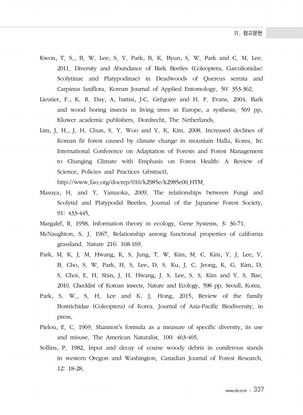Ⅳ. 참고문헌 www.nie.re.kr ? 337 Kwon, T. S., B. W. Lee, S. Y. Park, B. K. Byun, S. W. Park and C. M. Lee. 2011. Diversity and Abundance of Bark Beetles Coleoptera, CurculionidaeScolytinae and Platypodinae in Deadwoods of Quercus serrata and Carpinus laxiflora. Korean Journal of Applied Entomology. 50353-362. Lieutier, F., K. R. Day, A, battisi, J-C. Gr?goire and H. F. Evans. 2004. Bark and wood boring...