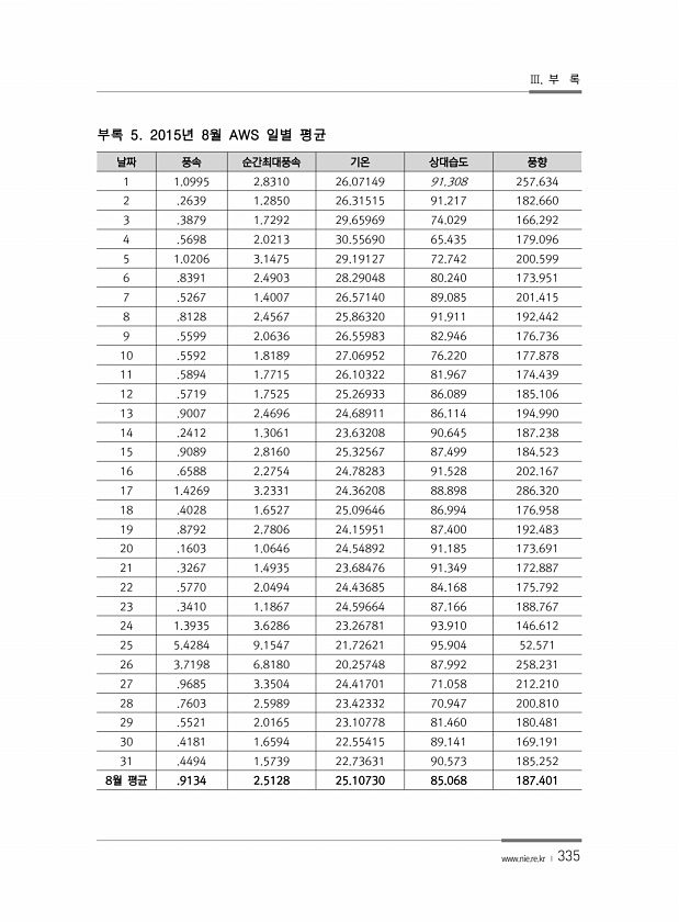 Ⅲ. 부 록 www.nie.re.kr ? 335 날짜 풍속 순간최대풍속 기온 상대습도 풍향 1 1.0995 2.8310 26.07149 91.308 257.634 2 .2639 1.2850 26.31515 91.217 182.660 3 .3879 1.7292 29.65969 74.029 166.292 4 .5698 2.0213 30.55690 65.435 179.096 5 1.0206 3.1475 29.19127 72.742 200.599 6 .8391 2.4903 28.29048 80.240 173.951 7 .5267 1.4007 26.57140 89.085 201.415 8 .8128 2.4567 25.86320 91.911 192.442 9 .5599 2.0636 26.55983 82.946 176....