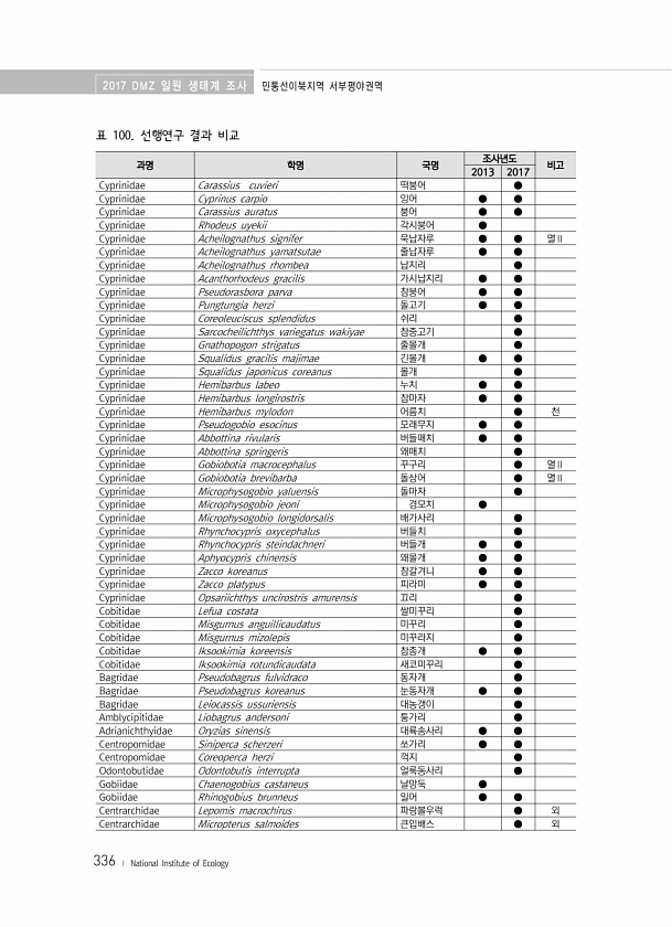 2017 DMZ 일원 생태계 조사 민통선이북지역 서부평야권역 336 ? National Institute of Ecology 과명 학명 국명 조사년도 비고 2013 2017 Cyprinidae Carassius cuvieri 떡붕어 ● Cyprinidae Cyprinus carpio 잉어 ● ● Cyprinidae Carassius auratus 붕어 ● ● Cyprinidae Rhodeus uyekii 각시붕어 ● Cyprinidae Acheilognathus signifer 묵납자루 ● ● 멸Ⅱ Cyprinidae Acheilognathus yamatsutae 줄납자루 ● ● Cyprinidae Acheilognathus rhombea 납지리 ● Cyprinidae Acanthorhodeus gracil...
