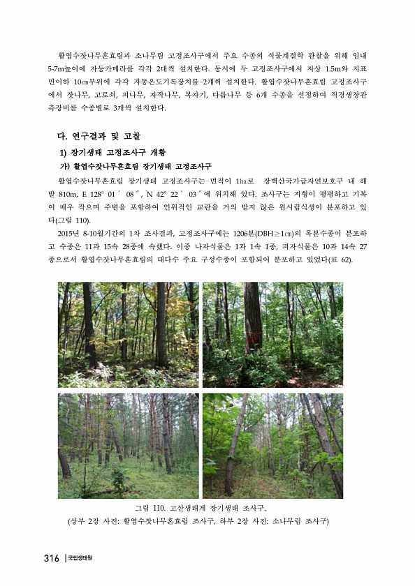 활엽수잣나무혼효림과 소나무림 고정조사구에서 주요 수종의 식물계절학 관찰을 위해 임내 높이에 자동카메라를 각각 대씩 설치한다 동시에 두 고정조사구에서 지상 와 지표 면이하 부위에 각각 자동온도기록장치를 개씩 설치한다 활엽수잣나무혼효림 고정조사구 에서 잣나무 고로쇠 피나무 자작나무 복자기 다릅나무 등 개 수종을 선정하여 직경생장관 측장비를 수종별로 개씩 설치한다 다 연구결과 및 고찰 장기생태 고정조사구 개황 가 활엽수잣나무혼효림 장기생태 고정조사구 활엽수잣나무혼효림 장기생태 고정조사구는 면적이 로 장백산국가급자연보호구 내 해 발 에 위치해 있다 조사구는 지형이 평평하고 기복 이 매우 작으며 주변을 포함하여 인위적인 교란을 거의 받지 않은 원시림식생이 분포하고 있 다 그림 년 월기간의 차 조사결과 고정조사구에는 ...