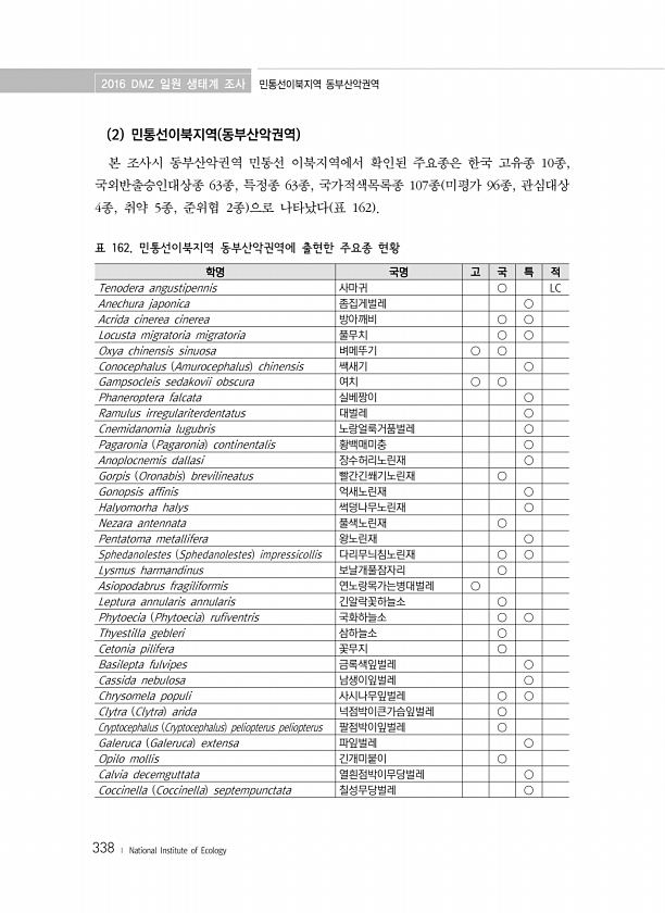 2016 DMZ 일원 생태계 조사 민통선이북지역 동부산악권역 338 ? National Institute of Ecology 학명 국명 고 국 특 적 Tenodera angustipennis 사마귀 ○ LC Anechura japonica 좀집게벌레 ○ Acrida cinerea cinerea 방아깨비 ○ ○ Locusta migratoria migratoria 풀무치 ○ ○ Oxya chinensis sinuosa 벼메뚜기 ○ ○ Conocephalus Amurocephalus chinensis 쌕새기 ○ Gampsocleis sedakovii obscura 여치 ○ ○ Phaneroptera falcata 실베짱이 ○ Ramulus irregulariterdentatus 대벌레 ○ Cnemidanomia...