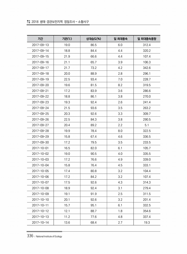 2018 생태·경관보전지역 정밀조사 소황사구 336 ? National Institute of Ecology 기간 기온 ℃ 상대습도 % 일 최대풍속 일 최대풍속풍향 2017-09-13 19.0 86.5 6.0 312.4 2017-09-14 18.8 84.4 4.4 320.2 2017-09-15 21.9 66.6 4.4 107.4 2017-09-16 21.1 65.7 3.9 106.3 2017-09-17 21.7 73.2 4.2 342.6 2017-09-18 20.0 88.9 2.8 296.1 2017-09-19 22.5 93.4 7.0 228.7 2017-09-20 19.6 81.5 8.2 319.5 2017-09-21 17.2 83.9 3.6 286.6 2017-09-22 18.8 86.1 3.8 270....