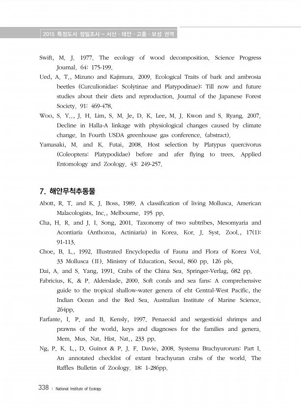 2015 특정도서 정밀조사 서산·태안·고흥·보성 권역 338 ? National Institute of Ecology Swift, M. J. 1977. The ecology of wood decomposition. Science Progress Journal. 64175-199. Ued, A. T., Mizuno and Kajimura. 2009. Ecological Traits of bark and ambrosia beetles CurculionidaeScolytinae and Platypodinae Till now and future studies about their diets and reproduction. Journal of the Japanese Forest Society. 91469-478. W...