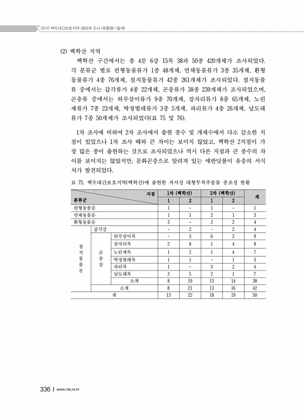 2016 백두대간보호지역 생태계 조사 추풍령밀재 336Ⅰwww.nie.re.kr 2 백학산 지역 백학산 구간에서는 총 4문 6강 15목 38과 50종 420개체가 조사되었다. 각 분류군 별로 편형동물류가 1종 48개체, 연체동물류가 3종 35개체, 환형 동물류가 4종 76개체, 절지동물류가 42종 261개체가 조사되었다. 절지동물 류 중에서는 갑각류가 4종 22개체, 곤충류가 38종 239개체가 조사되었으며, 곤충류 중에서는 하루살이류가 9종 70개체, 잠자리류가 8종 65개체, 노린 재류가 7종 23개체, 딱정벌레류가 3종 5개체, 파리류가 4종 26개체, 날도래 류가 7종 50개체가 조사되었다 표 75 및 76 1차 조사에 비하여 2차 조사에서 출현 종수 및 개체수에서 다소 감소한 지 점이 있었으나 1차...