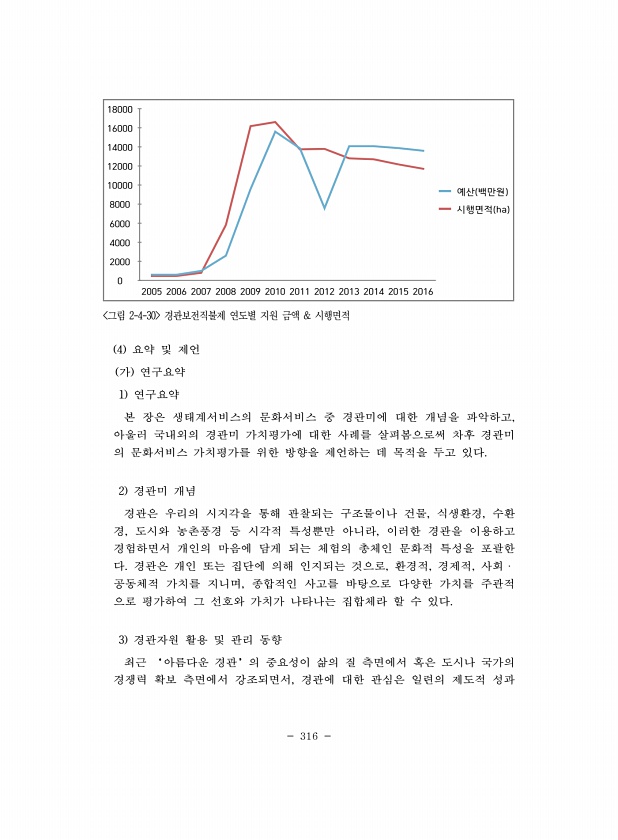 316 0 2000 4000 6000 8000 10000 12000 14000 16000 18000 2005 2006 2007 2008 2009 2010 2011 2012 2013 2014 2015 2016 예산 백만원 시행면적 ha 그림 2-4-30 경관보전직불제 연도별 지원 금액 & 시행면적 4 요약 및 제언 가 연구요약 1 연구요약 본 장은 생태계서비스의 문화서비스 중 경관미에 대한 개념을 파악하고, 아울러 국내외의 경관미 가치평가에 대한 사례를 살펴봄으로써 차후 경관미 의 문화서비스 가치평가를 위한 방향을 제언하는 데 목적을 두고 있다. 2 경관미 개념 경관은 우리의 시지각을 통해 관찰되는 구조물이나 건물, 식생환경, 수환 경, 도시와 농촌풍경 등 시각적 특성뿐만 아니라, 이러한 경관을 이용하고 경험...