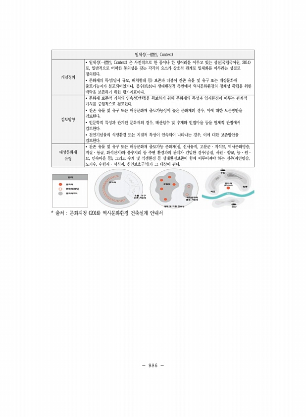 986 일체성 一體性, Context 개념정의 ? 일체성 一體性, Context 은 사전적으로 한 몸이나 한 덩어리를 이루고 있는 성질 국립국어원, 2014 로, 일반적으로 어떠한 동의성을 갖는 각각의 요소가 상호적 관계로 일체화를 이루려는 성질로 정의된다. ? 문화재의 특성 당시 규모, 배치형태 등 보존과 더불어 잔존 유물 및 유구 또는 매장문화재 출토가능지가 분포되어있거나, 풍수 風水 나 생태환경적 측면에서 역사문화환경의 정체성 확립을 위한 맥락을 보존하기 위한 평가지표이다. 검토방향 ? 문화재 보존적 가치의 연속성 맥락 을 확보하기 위해 문화재의 특성과 입지환경이 이루는 관계적 가치를 중점적으로 검토한다. ? 잔존 유물 및 유구 또는 매장문화재 출토가능성이 높은 문화재의 경우, 이에 대한 보존방안을 검...