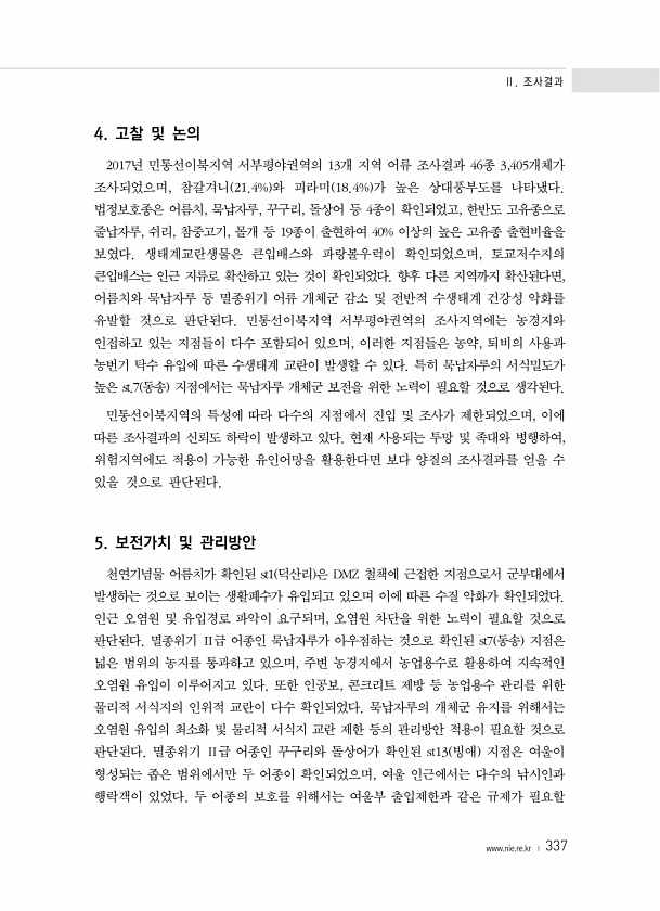 Ⅱ. 조사결과 www.nie.re.kr ? 337 4. 고찰 및 논의 2017년 민통선이북지역 서부평야권역의 13개 지역 어류 조사결과 46종 3,405개체가 조사되었으며, 참갈겨니 21.4% 와 피라미 18.4% 가 높은 상대풍부도를 나타냈다. 법정보호종은 어름치, 묵납자루, 꾸구리, 돌상어 등 4종이 확인되었고, 한반도 고유종으로 줄납자루, 쉬리, 참중고기, 몰개 등 19종이 출현하여 40% 이상의 높은 고유종 출현비율을 보였다. 생태계교란생물은 큰입배스와 파랑볼우럭이 확인되었으며, 토교저수지의 큰입배스는 인근 지류로 확산하고 있는 것이 확인되었다. 향후 다른 지역까지 확산된다면, 어름치와 묵납자루 등 멸종위기 어류 개체군 감소 및 전반적 수생태계 건강성 악화를 유발할 것으로 판단된다. 민통선이북지역 서...