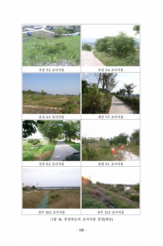 328 옥천 5-2 조사지점 옥천 5-4 조사지점 음성 6-1 조사지점 제천 7-7 조사지점 진천 8-2 조사지점 증평 9-1 조사지점 청주 10-2 조사지점 충주 11-5 조사지점 그림 36. 충청북도의 조사지점 전경 계속