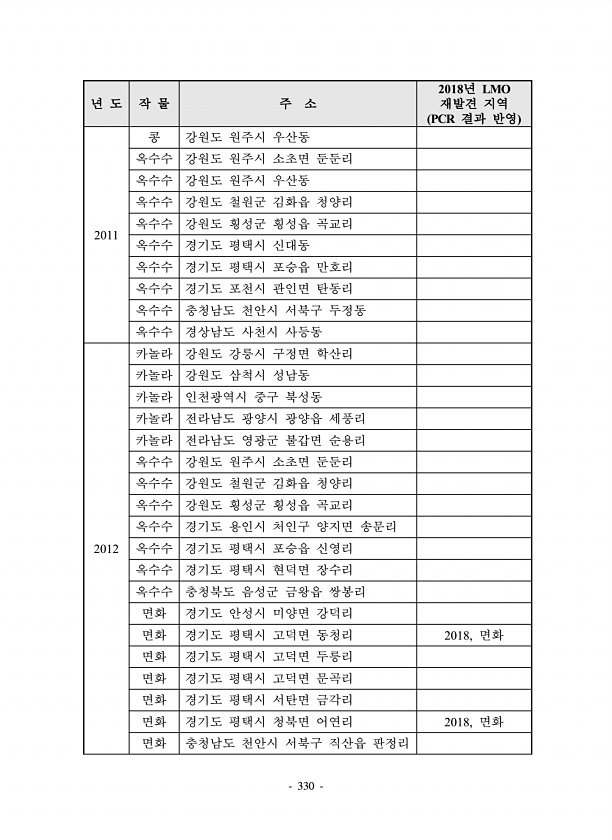 330 년 도 작 물 주 소 2018년 LMO 재발견 지역 PCR 결과 반영 2011 콩 강원도 원주시 우산동 옥수수 강원도 원주시 소초면 둔둔리 옥수수 강원도 원주시 우산동 옥수수 강원도 철원군 김화읍 청양리 옥수수 강원도 횡성군 횡성읍 곡교리 옥수수 경기도 평택시 신대동 옥수수 경기도 평택시 포승읍 만호리 옥수수 경기도 포천시 관인면 탄동리 옥수수 충청남도 천안시 서북구 두정동 옥수수 경상남도 사천시 사등동 2012 카놀라 강원도 강릉시 구정면 학산리 카놀라 강원도 삼척시 성남동 카놀라 인천광역시 중구 북성동 카놀라 전라남도 광양시 광양읍 세풍리 카놀라 전라남도 영광군 불갑면 순용리 옥수수 강원도 원주시 소초면 둔둔리 옥수수 강원도 철원군 김화읍 청양리 옥수수 강원도 횡성군 횡성읍 곡교리 옥수수 경기도 ...