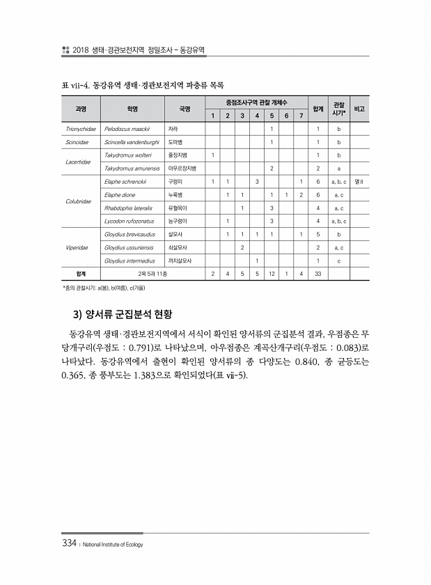 2018 생태·경관보전지역 정밀조사 동강유역 334 ? National Institute of Ecology 과명 학명 국명 중점조사구역 관찰 개체수 합계 관찰 1 2 3 4 5 6 7 시기* 비고 Trionychidae Pelodiscus maackii 자라 1 1 b Scincidae Scincella vandenburghi 도마뱀 1 1 b Lacertidae Takydromus wolteri 줄장지뱀 1 1 b Takydromus amurensis 아무르장지뱀 2 2 a Colubridae Elaphe schrenckii 구렁이 1 1 3 1 6 a, b, c 멸Ⅱ Elaphe dione 누룩뱀 1 1 1 1 2 6 a, c Rhabdophis lateralis 유혈목이 1 3 4 a, c Lycod...