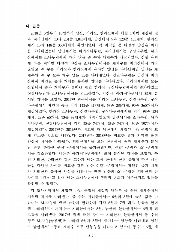 317 나. 곤충 2018년 5월부터 10월까지 남산, 지리산, 한라산에서 매월 1회씩 채집한 결 과 지리산에서 13과 204종 1,048개체, 남산에서 9과 120종 455개체, 한라산 에서 13과 148종 350개체가 확인되었다. 각 지역별 종 다양성 양상은 차이 를 나타내었는데 남산에서는 아카시나무림, 지리산에서는 구상나무림, 한라 산에서는 소나무림에서 가장 많은 종 수와 개체수가 채집되었다. 산림 유형 에 따른 지역별 다양성 양상은 소나무림에서는 개체수는 지리산에서 가장 많았고 종 수는 지리산과 한라산에서 유사한 양상을 나타냈지만 남산은 개 체수와 종 수 모두 매우 낮은 값을 나타내었다. 신갈나무림은 남산과 지리 산에서 확인된 종과 개체는 유사한 양상을 나타내었다. 지리산에서는 모든 산림에서 종과 개...