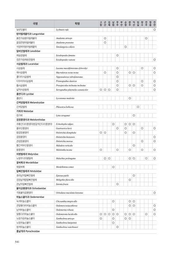 346 늦반딧불이 Lychnuris rufa ○ 방아벌레붙이과 Languriidae 붉은가슴방아벌레붙이 Anadastus atriceps ○ ○ 끝검은방아벌레붙이 Anadastus praeustus ○ 석점박이방아벌레붙이 Tetralanguria collaris ○ 알버섯벌레과 Leiodidae 애송장벌레 Sciodrepoides fumatus ○ 검은가슴애송장벌레 Sciodrepoides watsoni ○ 사슴벌레과 Lucanidae 사슴벌레 Lucanus maculifemoratus dybowskyi ○ ○ ○ 애사슴벌레 Macrodorcas rectus rectus ○ ○ ○ ○ ○ 홍다리사슴벌레 Nipponodorcus rubrofemoratus ○ 다우리아사슴벌레 Prismognathus dauri...