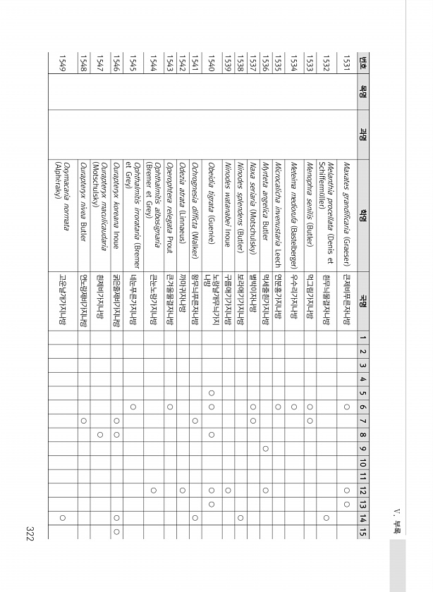 Ⅴ. 부록 322 번호 목명 과명 학명 국명 1 2 3 4 5 6 7 8 9 10 11 12 13 14 15 1531 Maxates grandificaria Graeser 큰제비푸른자나방 ○ ○ ○ 1532 Melanthia procellata Denis et Schifferm?ller 흰무늬물결자나방 ○ 1533 Menophra senilis Butler 먹그림가지나방 ○ ○ 1534 Meteima mediorufa Bastelberger 우수리가지나방 ○ 1535 Microcalicha invenustaria Leech 연분홍가지나방 ○ 1536 Myrteta angelica Butler 먹세줄흰가지나방 ○ ○ 1537 Naxa seriaria Motschulsky 별박이자나방 ○ ○ 1538 Ninod...
