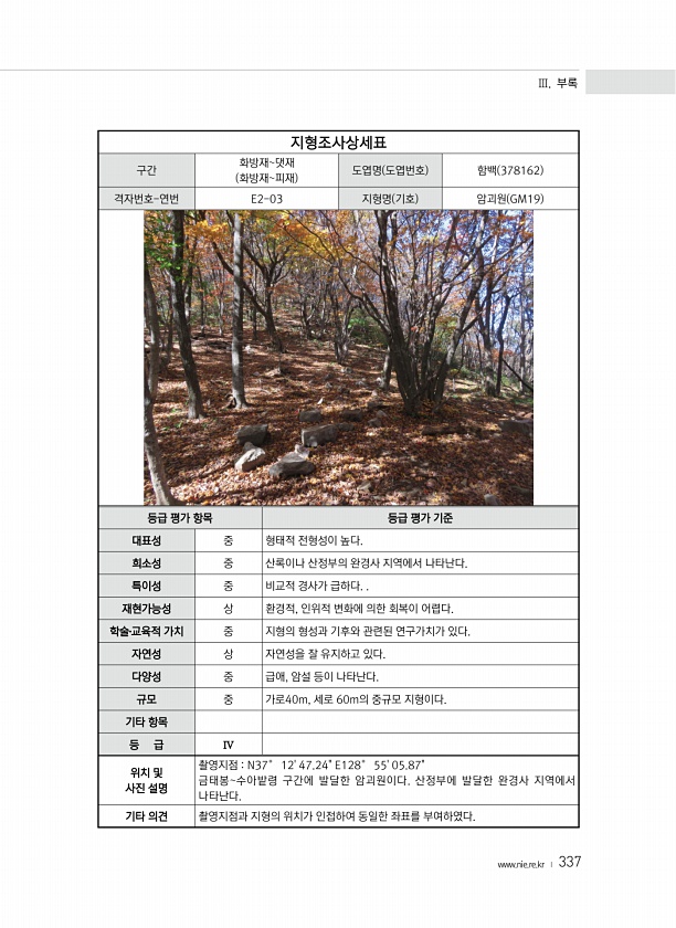 Ⅲ. 부록 www.nie.re.kr ? 337 지형조사상세표 구간 화방재댓재 화방재피재 도엽명 도엽번호 함백 378162 격자번호-연번 E2-03 지형명 기호 암괴원 GM19 등급 평가 항목 등급 평가 기준 대표성 중 형태적 전형성이 높다. 희소성 중 산록이나 산정부의 완경사 지역에서 나타난다. 특이성 중 비교적 경사가 급하다. 재현가능성 상 환경적, 인위적 변화에 의한 회복이 어렵다. 학술?교육적 가치 중 지형의 형성과 기후와 관련된 연구가치가 있다. 자연성 상 자연성을 잘 유지하고 있다. 다양성 중 급애, 암설 등이 나타난다. 규모 중 가로40m, 세로 60m의 중규모 지형이다. 기타 항목 등 급 Ⅳ 위치 및 사진 설명 촬영지점 N37° 1247.24E128° 5505.87금태봉수아밭령 구간에 발달한 암...
