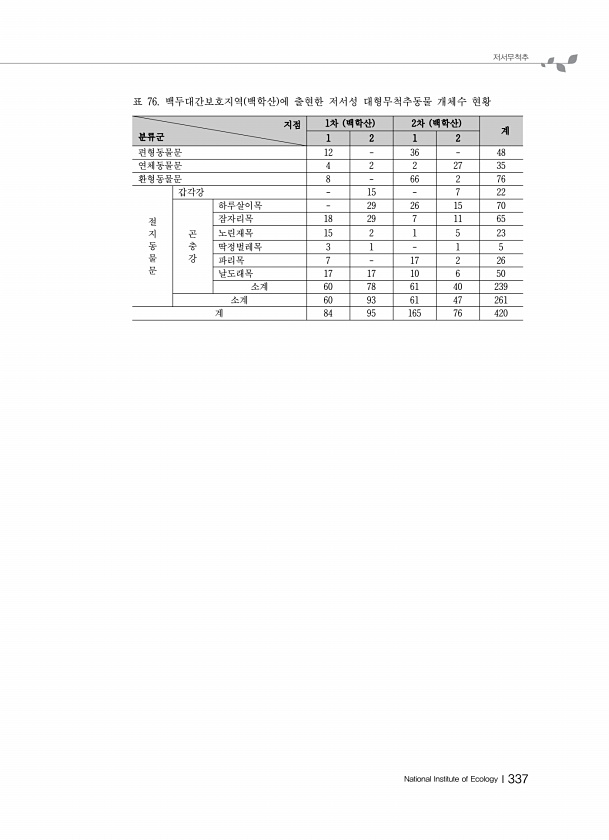 저서무척추 National Institute of EcologyⅠ337 지점 분류군 1차 백학산 2차 백학산 계 1 2 1 2 편형동물문 12 36 48 연체동물문 4 2 2 27 35 환형동물문 8 66 2 76 절 지 동 물 문 갑각강 15 7 22 곤 충 강 하루살이목 29 26 15 70 잠자리목 18 29 7 11 65 노린재목 15 2 1 5 23 딱정벌레목 3 1 1 5 파리목 7 17 2 26 날도래목 17 17 10 6 50 소계 60 78 61 40 239 소계 60 93 61 47 261 계 84 95 165 76 420 표 76. 백두대간보호지역 백학산 에 출현한 저서성 대형무척추동물 개체수현황