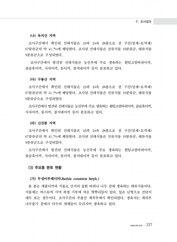 Ⅱ. 조사결과 www.nie.re.kr ? 337 나 옥석산 지역 조사구간에서 확인된 선태식물은 23과 24속 28종으로 전 구간 밀재묘적재 67분류군의 약 41.7%에 해당한다. 조사된 선태식물은 선류식물 19분류군, 태류식물 9분류군으로 구성되었다. 조사구간에서 발견된 선태식물은 능선부에 주로 생육하는 흰털고깔바위이끼, 곱슬혹이끼, 사자이끼, 톳이끼, 참지네이끼 등이 분포하고 있다. 다 구룡산 지역 조사구간에서 확인된 선태식물은 23과 24속 28종으로 전 구간 밀재묘적재 67분류군의 약 41.7%에 해당한다. 조사된 선태식물은 선류식물 19분류군, 태류식물 9분류군으로 구성되었다. 조사구간에서 발견된 선태식물은 능선부에 주로 생육하는 흰털고깔바위이끼, 곱슬혹이끼, 사자이끼, 톳이끼, 참지네이끼 등이 분...