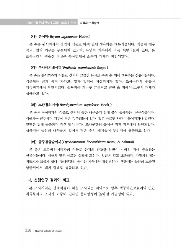 2017 백두대간보호지역 생태계 조사 묘적재 화방재 338 ? National Institute of Ecology 나 은이끼 Bryum argenteum Hedw. 본 종은 귀이끼과의 경엽체 식물로 바위 겉에 생육하는 태류식물이다. 식물체 매우 작고, 잎의 기부는 부풀어져 있으며, 복엽의 기부에서 작은 헛뿌리들이 있다. 본 조사구간의 주흘산 정상부 북사면에서 소수의 개체가 확인되었다. 다 우사미지네이끼 Frullania usamienesis Steph. 본 종은 솔이끼과의 식물로 산지의 그늘진 등산로 주변 흙 위에 생육하는 선류식물이다. 식물체는 곧게 서며 자라고, 잎과 잎맥에 치상거치가 있다. 조사구간의 주흘산 계곡지역에서 확인되었다. 생육지는 계곡부 그늘지고 습한 흙 위에서 소수의 개체가 생육하고 있다...