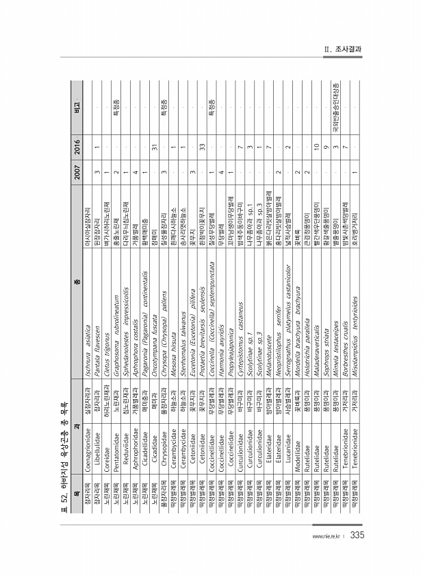 335 목 과 종 2007 2016 비고 잠자리목 Coenagrionidae 실잠자리과 Ischnura asiatica 아시아실잠자리 잠자리목 Libellulidae 잠자리과 Pantala flavescen 된장잠자리 3 1 노린재목 Coreidae 허리노린재과 Cletus trigonus 벼가시허리노린재 1 노린재목 Pentatomidae 노린재과 Graphosoma rubrolineatum 홍줄노린재 2 특정종 노린재목 Reduviidae 침노린재과 Sphedanolestes impressicollis 다리무늬침노린재 1 노린재목 Aphrophoridae 거품벌레과 Aphrophora costalis 거품벌레 4 노린재목 Cicadellidae 매미충과 Pagaronia ...