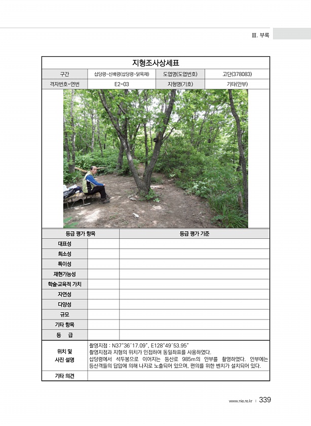 Ⅲ. 부록 www.nie.re.kr ? 339 지형조사상세표 구간 삽당령신배령 삽당령닭목재 도엽명 도엽번호 고단 378083 격자번호-연번 E2-03 지형명 기호 기타 안부 등급 평가 항목 등급 평가 기준 대표성 희소성 특이성 재현가능성 학술?교육적 가치 자연성 다양성 규모 기타 항목 등 급 위치 및 사진 설명 촬영지점 N37°36′17.09″, E128°49′53.95″ 촬영지점과 지형의 위치가 인접하여 동일좌표를 사용하였다. 삽당령에서 석두봉으로 이어지는 등산로 985m의 안부를 촬영하였다. 안부에는 등산객들의 답압에 의해 나지로 노출되어 있으며, 편의를 위한 벤치가 설치되어 있다. 기타의견