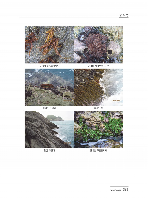 V. 부 록 www.nie.re.kr ?339 구멍섬 뿔등풀가사리 구멍섬 애기우뭇가사리 중결도 조간대 중결도 톳 용섬 조간대 건너섬구멍갈파래