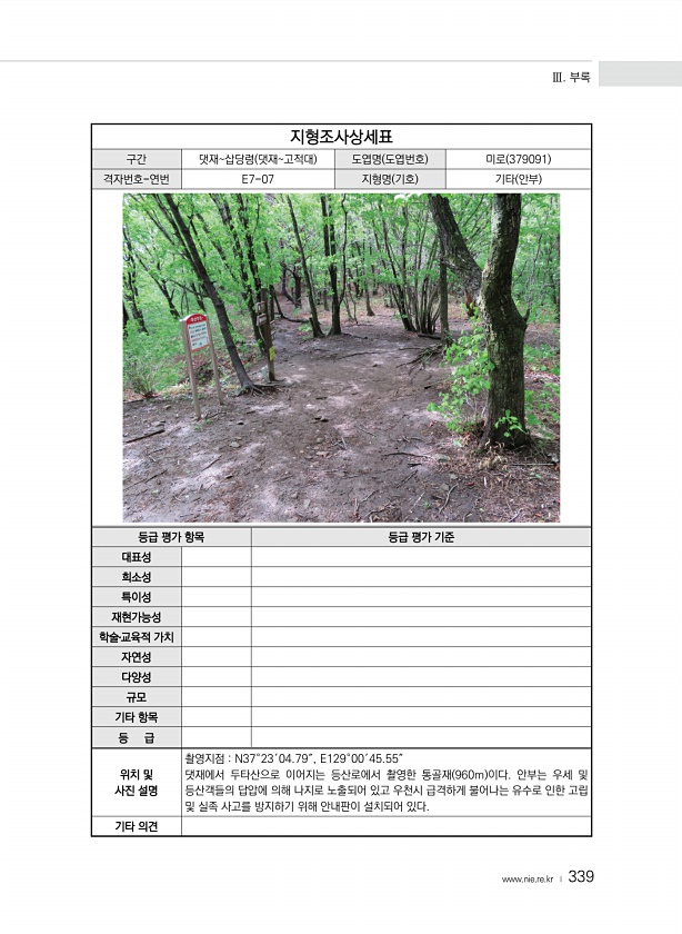 Ⅲ. 부록 www.nie.re.kr ? 339 지형조사상세표 구간 댓재삽당령 댓재고적대 도엽명 도엽번호 미로 379091 격자번호-연번 E7-07 지형명 기호 기타 안부 등급 평가 항목 등급 평가 기준 대표성 희소성 특이성 재현가능성 학술?교육적 가치 자연성 다양성 규모 기타 항목 등 급 위치 및 사진 설명 촬영지점 N37°23′04.79″, E129°00′45.55″ 댓재에서 두타산으로 이어지는 등산로에서 촬영한 통골재 960m 이다. 안부는 우세 및 등산객들의 답압에 의해 나지로 노출되어 있고 우천시 급격하게 불어나는 유수로 인한 고립 및 실족 사고를 방지하기 위해 안내판이 설치되어 있다. 기타의견