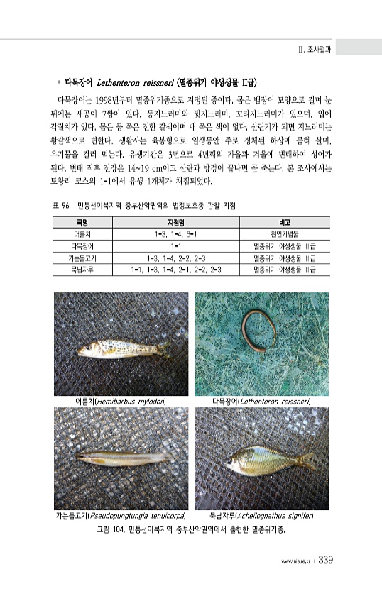 Ⅱ. 조사결과 www.nie.re.kr ? 339 ? 다묵장어 Lethenteron reissneri 멸종위기 야생생물 II급 다묵장어는 1998년부터 멸종위기종으로 지정된 종이다. 몸은 뱀장어 모양으로 길며 눈 뒤에는 새공이 7쌍이 있다. 등지느러미와 뒷지느러미, 꼬리지느러미가 있으며, 입에 각질치가 있다. 몸은 등 쪽은 진한 갈색이며 배 쪽은 색이 없다. 산란기가 되면 지느러미는 황갈색으로 변한다. 생활사는 육봉형으로 일생동안 주로 정체된 하상에 묻혀 살며, 유기물을 걸러 먹는다. 유생기간은 3년으로 4년째의 가을과 겨울에 변태하여 성어가 된다. 변태 직후 전장은 1419 cm이고 산란과 방정이 끝나면 곧 죽는다. 본 조사에서는 도창리 코스의 1-1에서 유생 1개체가 채집되었다. 국명 지점명 비고 어름치...
