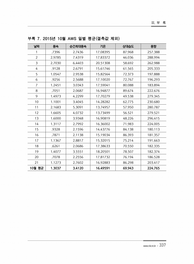 Ⅲ. 부 록 www.nie.re.kr ? 337 날짜 풍속 순간최대풍속 기온 상대습도 풍향 1 .7396 2.7436 17.08395 87.968 257.388 2 2.9785 7.4319 17.83372 46.036 288.994 3 2.7030 6.4403 20.51308 58.692 262.988 4 .9128 2.6791 15.61746 61.565 205.333 5 1.0547 2.9538 15.82564 72.373 197.888 6 .9256 2.5688 17.10020 72.767 196.293 7 1.2451 3.0343 17.59041 80.088 183.894 8 .7051 2.0687 16.94877 89.674 222.676 9 1.4973 4.2299 17.70279 49.538 2...