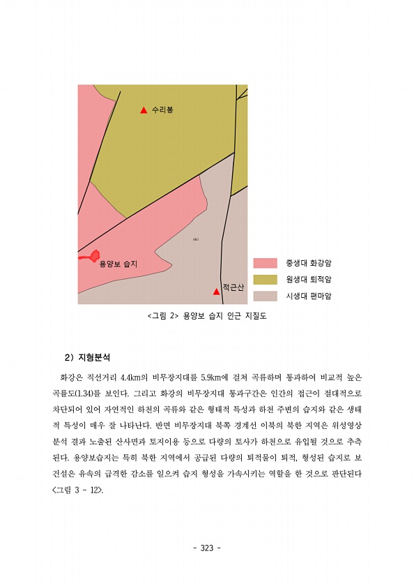 323 그림 2 용양보 습지 인근 지질도 화강은 직선거리 의 비무장지대를 에 걸쳐 곡류하며 통과하여 비교적 높은 4.4km 5.9km 곡률도 를 보인다 그리고 화강의 비무장지대 통과구간은 인간의 접근이 절대적으로 1.34 차단되어 있어 자연적인 하천의 곡류와 같은 형태적 특성과 하천 주변의 습지와 같은 생태 적 특성이 매우 잘 나타난다 반면 비무장지대 북쪽 경계선 이북의 북한 지역은 위성영상 분석 결과 노출된 산사면과 토지이용 등으로 다량의 토사가 하천으로 유입될 것으로 추측 된다 용양보습지는 특히 북한 지역에서 공급된 다량의 퇴적물이 퇴적 형성된 습지로 보 , 건설은 유속의 급격한 감소를 일으켜 습지 형성을 가속시키는 역할을 한 것으로 판단된다 3 그림 12