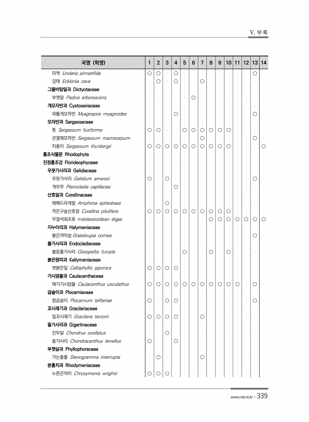 V. 부 록 www.nie.re.kr ?339 국명 학명 1 2 3 4 5 6 7 8 9 10 11 12 13 14 미역 Undaria pinnatifida ○ ○ ○ ○ 감태 Ecklonia cava ○ ○ ○ 그물바탕말과 Dictyotaceae 부챗말 Padina arborescens ○ 개모자반과 Cystoseiraceae 외톨개모자반 Myagropsis myagroides ○ ○ 모자반과 Sargassaceae 톳 Sargassum fusiforme ○ ○ ○ ○ ○ ○ ○ ○ 큰열매모자반 Sargassum macrocarpum ○ ○ 지충이...