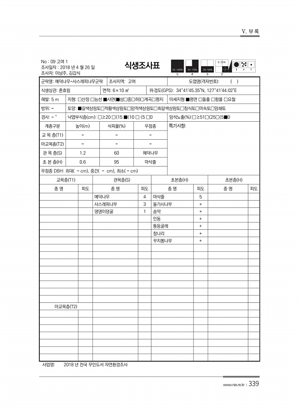 V. 부 록 www.nie.re.kr ?339 No 09 고여 1 조사일자 2018 년 4 월 26 일 조사자이남주, 김갑식 식생조사표 군락명예덕나무-사스레피나무군락 조사지역고여 도엽명 격자번호 식생상관혼효림 면적6×10 ㎡ 위?경도 GPS 34°4145.35N, 127°4144.02E 해발5 m 지형□산정 □능선 ■사면 ■상□중□하 □계곡□평지 미세지형■평면 □돌출 □함몰 □요철 방위토양■갈색삼림토□적황색삼림토□암적색삼림토□회갈색삼림토□침식토□미숙토□암쇄토 경사° 낙엽부식층 cm □≥20 □ 15 ■ 10 □ 5 □0 암석노출 % □≥51□ 25□ 5■0 계층구분 높이 m 식피율 % 우점종 특기사항교 목 층 T1 아교목층 T2 관 목 층 S 1.2 60 예덕나무 초 본 층 H 0.6 95 마삭줄 우점종 D...