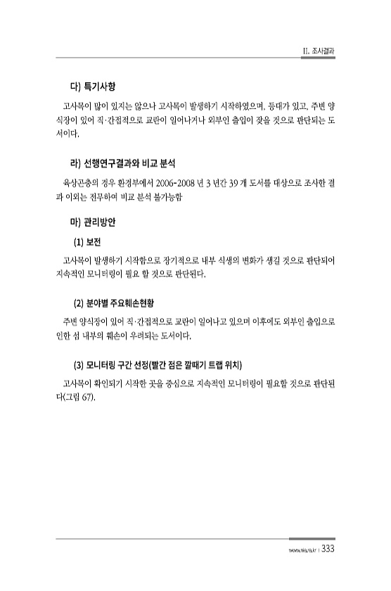 II. 조사결과 www.nie.re.kr ?333 고사목이 많이 있지는 않으나 고사목이 발생하기 시작하였으며, 등대가 있고, 주변 양 식장이 있어 직·간접적으로 교란이 일어나거나 외부인 출입이 잦을 것으로 판단되는 도 서이다. 육상곤충의 경우 환경부에서 2006-2008 년 3 년간 39 개 도서를 대상으로 조사한 결 과 이외는 전무하여 비교 분석 불가능함 1 고사목이 발생하기 시작함으로 장기적으로 내부 식생의 변화가 생길 것으로 판단되어 지속적인 모니터링이 필요 할 것으로 판단된다. 2 주변 양식장이 있어 직·간접적으로 교란이 일어나고 있으며 이후에도 외부인 출입으로 인한 섬 내부의 훼손이 우려되는 도서이다. 3 고사목이 확인되기 시작한 곳을 중심으로 지속적인 모니터링이 필요할 것으로 판단된 다 그림 67