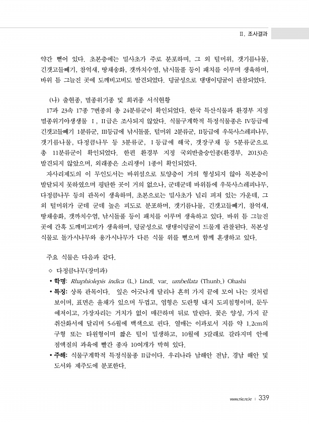 Ⅱ. 조사결과 www.nie.re.kr ? 339 약간 뻗어 있다. 초본층에는 밀사초가 주로 분포하며, 그 외 털머위, 갯기름나물, 긴갯고들빼기, 참억새, 땅채송화, 갯까치수염, 낚시돌풀 등이 패치를 이루며 생육하며, 바위 틈 그늘진 곳에 도깨비고비도 발견되었다. 덩굴성으로 댕댕이덩굴이 관찰되었다. 나 출현종, 멸종위기종 및 희귀종 서식현황 17과 23속 17종 7변종의 총 24분류군이 확인되었다. 한국 특산식물과 환경부 지정 멸종위기야생생물 Ⅰ, Ⅱ급은 조사되지 않았다. 식물구계학적 특정식물종은 IV등급에 긴갯고들빼기 1분류군, III등급에 낚시돌풀, 털머위 2분류군, II등급에 우묵사스레피나무, 갯기름나물, 다정큼나무 등 3분류군, Ⅰ등급에 해국, 갯장구채 등 5분류군으로 총 11분류군이 확인되었다. 한...