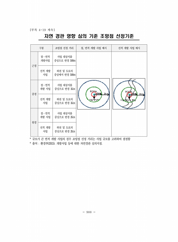 988 [부록 4-19 계속] 자연 경관 영향 심의 기준 조망점 선정기준 구분 조망점 선정 거리 점, 면적 개발 사업 예시 선적 개발 사업 예시 근경 점·면적 개발사업 사업 대상지를 중심으로 반경 500m 선적 개발 사업 하천 및 도로의 중심에서 반경 500m 중경 점·면적 개발 사업 사업 대상지를 중심으로 반경 1Km 선적 개발 사업 하천 및 도로의 중심으로 반경 1Km 원경 점·면적 개발 사업 사업 대상지를 중심으로 반경 2Km 선적 개발 사업 하천 및 도로의 중심으로 반경 2Km * 규모가 큰 면적 개발 사업의 경우 조망점 선정 거리는 사업 규모를 고려하여 결정함 * 출처 환경부 2015 개발사업 등에 대한 자연경관심의지침.