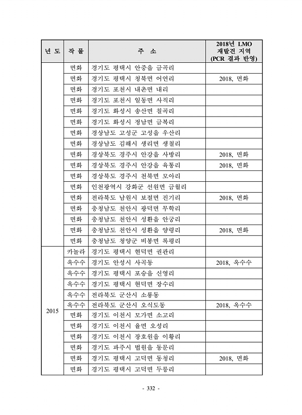 332 년 도 작 물 주 소 2018년 LMO 재발견 지역 PCR 결과 반영 면화 경기도 평택시 안중읍 금곡리 면화 경기도 평택시 청북면 어연리 2018, 면화 면화 경기도 포천시 내촌면 내리 면화 경기도 포천시 일동면 사직리 면화 경기도 화성시 송산면 칠곡리 면화 경기도 화성시 정남면 금복리 면화 경상남도 고성군 고성읍 우산리 면화 경상남도 김해시 생리면 생철리 면화 경상북도 경주시 안강읍 사방리 2018, 면화 면화 경상북도 경주시 안강읍 육통리 2018, 면화 면화 경상북도 경주시 천북면 모아리 면화 인천광역시 강화군 선원면 금월리 면화 전라북도 남원시 보절면 진기리 2018, 면화 면화 충청남도 천안시 광덕면 무학리 면화 충청남도 천안시 성환읍 안궁리 면화 충청남도 천안시 성환읍 양령리 2018, 면...