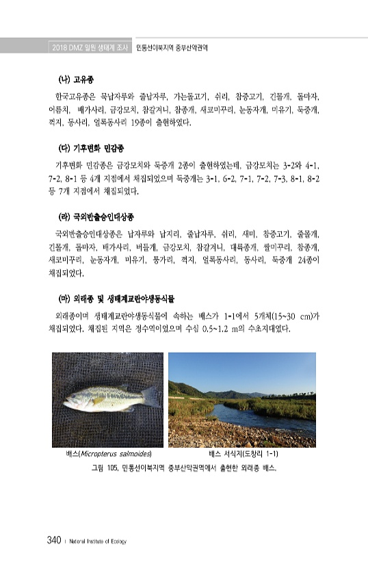 2018 DMZ 일원 생태계 조사 민통선이북지역 중부산악권역 340 ? National Institute of Ecology 나 고유종 한국고유종은 묵납자루와 줄납자루, 가는돌고기, 쉬리, 참중고기, 긴몰개, 돌마자, 어름치, 배가사리, 금강모치, 참갈겨니, 참종개, 새코미꾸리, 눈동자개, 미유기, 둑중개, 꺽지, 동사리, 얼록동사리 19종이 출현하였다. 다 기후변화 민감종 기후변화 민감종은 금강모치와 둑중개 2종이 출현하였는데, 금강모치는 3-2와 4-1, 7-2, 8-1 등 4개 지점에서 채집되었으며 둑중개는 3-1, 6-2, 7-1, 7-2, 7-3, 8-1, 8-2 등 7개 지점에서 채집되었다. 라 국외반출승인대상종 국외반출승인대상종은 납자루와 납지리, 줄납자루, 쉬리, 새미, 참중고기, 줄몰개, 긴...