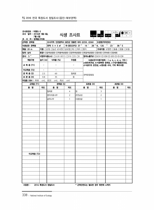 2016 전국 특정도서 정밀조사 옹진-북부권역 338 ? National Institute of Ecology 조사표번호 어평도-3 조사 일자 2016년 5월 6일, 7월 6일 조 사 자 방제용,이지효 식생 조사표 군락명관목림 조사지역인천광역시 옹진군 영흥면 외리 산259, 산260 도엽명 격자번호 식생상관관목림 면적5 × 5 ㎡ 위·경도 GPS 37 ° 14 ′ 28 ″N, 126 ° 23 ′ 38 ″E 해발20 m 지형□산정 □능선 ?사면 ?상?중□하 □계곡 □평지 미세지형?평면 □돌출 □함몰 □요철 방위남서 토양□갈색삼림토 □적황색삼림토 □암적색삼림토 □회갈색삼림토 □침식토 □미숙토 □암쇄토 경사5 ° 낙엽부식층 cm □≥20 ? 15 □ 10 □ 5 □0 암석노출 % □≥51 □〈50 □〈25 □〈5...