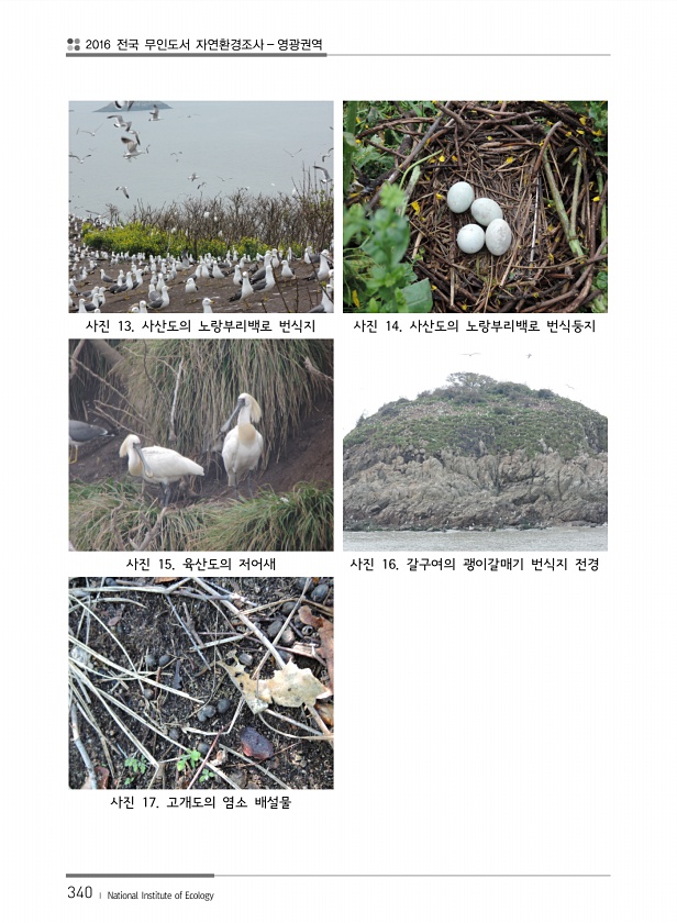 2016 전국 무인도서 자연환경조사 영광권역 340 ? National Institute of Ecology 사진 13. 사산도의 노랑부리백로 번식지 사진 14. 사산도의 노랑부리백로 번식둥지 사진 15. 육산도의 저어새 사진 16. 갈구여의 괭이갈매기 번식지 전경 사진 17. 고개도의 염소배설물