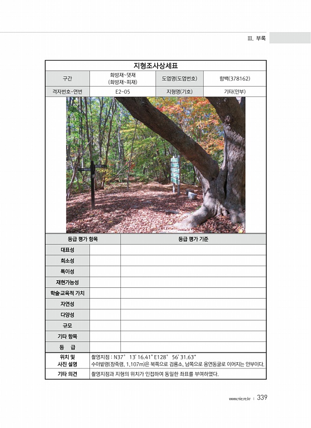 Ⅲ. 부록 www.nie.re.kr ? 339 지형조사상세표 구간 화방재댓재 화방재피재 도엽명 도엽번호 함백 378162 격자번호-연번 E2-05 지형명 기호 기타 안부 등급 평가 항목 등급 평가 기준 대표성 희소성 특이성 재현가능성 학술?교육적 가치 자연성 다양성 규모 기타 항목 등 급 위치 및 사진 설명 촬영지점 N37° 1316.41E128° 5631.63“ 수아밭령 창죽령, 1,107m 은 북쪽으로 검룡소, 남쪽으로 용연동굴로 이어지는 안부이다. 기타 의견 촬영지점과 지형의 위치가 인접하여 동일한 좌표를부여하였다.