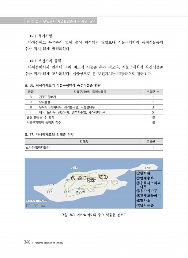 2015 전국 무인도서 자연환경조사 통영 권역 340 ? National Institute of Ecology 다 특기사항 바위섬이고 목본층이 없어 숲이 형성되지 않았으나 식물구계학적 특정식물종의 수가 적지 않게 발견되었다. 라 보전가치 등급 바위섬이어서 면적에 비해 비교적 식물종 수가 적으나, 식물구계학적 특정식물종 수는 적지 않게 조사되었다. 식물상으로 본 보전가치는 III등급으로 판단된다. 표 36. 자사리제도의 식물구계학적 특정식물종 현황 등급 식물구계학적 특정식물종 분류군 수 IV 긴갯고들빼기 1 III 낚시돌풀 1 II 우묵사스레피나무, 갯기름나물, 다정큼나무 3 I 해국, 돈나무, 갯장구채, 갯까치수염, 사스레피나무 5 출현 분류군 수 합계 10 식물구계학적 특정종 점수 18 표 37. 자사리제...