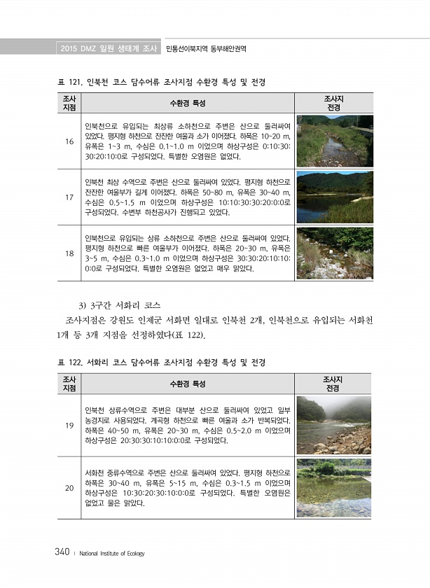 2015 DMZ 일원 생태계 조사 민통선이북지역 동부해안권역 340 ? National Institute of Ecology 조사 지점 수환경 특성 조사지 전경 19 인북천 상류수역으로 주변은 대부분 산으로 둘러싸여 있었고 일부 농경지로 사용되었다. 계곡형 하천으로 빠른 여울과 소가 반복되었다. 하폭은 4050 m, 유폭은 2030 m, 수심은 0.52.0 m 이었으며 하상구성은 203030101000로 구성되었다. 20 서화천 중류수역으로 주변은 산으로 둘러싸여 있었다. 평지형 하천으로 하폭은 3040 m, 유폭은 515 m, 수심은 0.31.5 m 이었으며 하상구성은 103020301000로 구성되었다. 특별한 오염원은 없었고 물은 맑았다. 표 122. 서화리 코스 담수어류 조사지점 수환경 특성 및 전경...