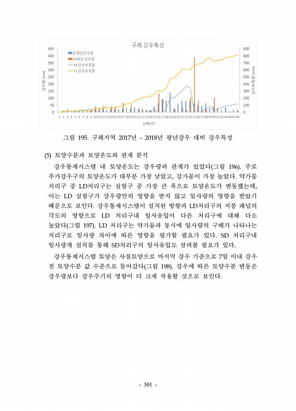 301 그림 195. 구례지역 2017년 2018년 평년강우 대비 강우특성 5 토양수분과 토양온도와 관계 분석 강우통제시스템 내 토양온도는 강우량과 관계가 있었다 그림 196 주로 추가강우구의 토양온도가 대부분 가장 낮았고, 강가뭄이 가장 높았다. 약가뭄 처리구 중 LD처리구는 실험구 중 가장 큰 폭으로 토양온도가 변동했는데, 이는 LD 실험구가 강우량만의 영향을 받지 않고 일사량의 영향을 받았기 때문으로 보인다. 강우통제시스템이 설치된 방향과 LD처리구의 지붕 패널의 각도의 영향으로 LD 처리구내 일사유입이 다른 처리구에 대해 다소 높았다 그림 197 LD 처리구는 약가뭄과 동시에 일사량의 구배가 나타나는 처리구로 일사량 차이에 따른 영향을 평가할 필요가 있다. SD 처리구내 일사량계 설치를 통해 SD처리...