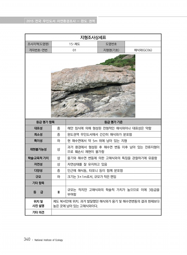 2015 전국 무인도서 자연환경조사 완도 권역 340 ? National Institute of Ecology 지형조사상세표 조사지역 도엽명 15-제도 도엽번호 격자번호-연번 01 지형명 기호 해식와 GC06 등급 평가 항목 등급 평가 기준 대표성 중 해안 침식에 의해 형성된 전형적인 해식와이나 대표성은 약함 희소성 중 완도권역 무인도서에서 간간히 해식와가 분포함 특이성 하 현 해수면에서 약 5m 위에 남아 있는 지형 재현불가능성 상 과거 환경에서 형성된 후 해수면 변동 이후 남아 있는 잔류지형이 므로 훼손시 재현이 불가함 학술?교육적 가치 상 융기와 해수면 변동에 의한 고해식와의 특징을 관찰하기에 유용함 자연성 상 자연상태를 잘 유지하고 있음 다양성 중 인근에 해식동, 타포니 등이 함께 분포함 규모 하 크...
