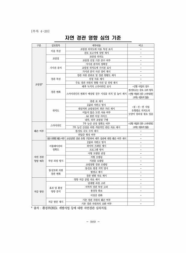 989 구분 검토항목 세부내용 비고 조망점* 이용 특성 조망점 위치도에 이용 특성 표시 검토 보고서에 설명 제시 조망점 조망점 위치도 조망점 선정 기준 준수 여부 가시권 분석 가시권 분석의 정확성 조망점 위치도에 가시권 표시 가시권 분석 사진 장비 제시 경관 특성 경관 자원 분류표 및 경관 현황도 제시 선정 사유 제시 주요 경관 자원의 현황 사진 및 설명 제시 경관 변화 배후 녹지의 스카이라인 표시 ?선형 사업의 경우 절?성토고는 중요 고려 항목 ?선형사업의경우스카이라인 고려는필요치않음 스카이라인의 변화가 예상될 경우 시설물 위치 및 높이 제시 위치도 총괄 표 제시 ?점·선·면 사업 유형별로 위치도의 모양이 달라질 필요 있음 Z값과 지반고 명시 대상지와 조망점간의 최단 거리 제시 어둡지 않은 도면 사용 여부...