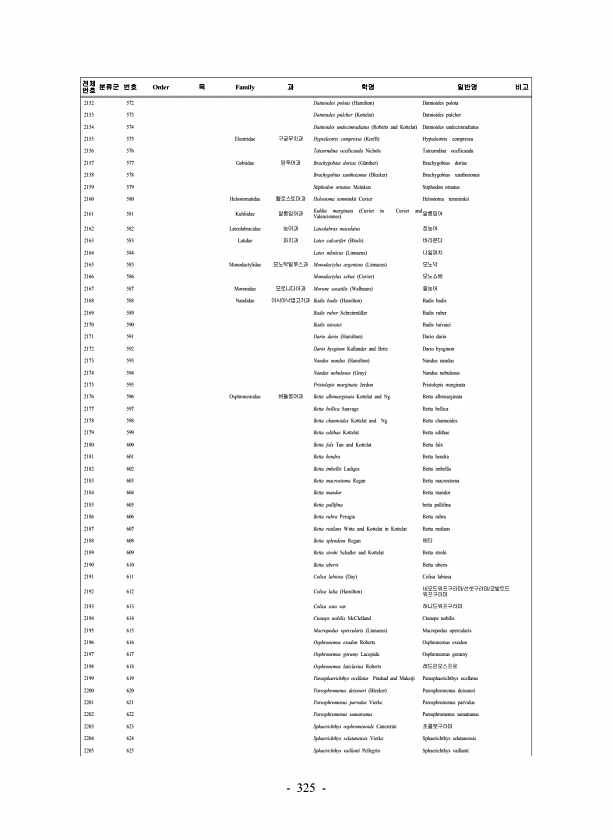 325 전체 번호 분류군 번호 Order 목 Family 과 학명 일반명 비고 2152 572 Datnioides polota Hamilton Datnioides polota 2153 573 Datnioides pulcher Kottelat Datnioides pulcher 2154 574 Datnioides undecimradiatus Roberts and Kottelat Datnioides undecimradiatus 2155 575 Eleotridae 구굴무치과 Hypseleotris compressa Krefft Hypseleotris compressa 2156 576 Tateurndina ocellicauda Nichols Tateurndina ocellicauda 2157 577 Gobiidae ...