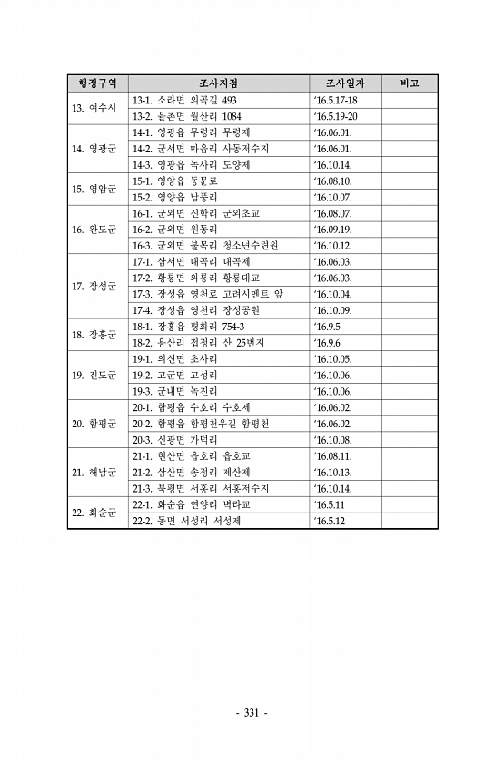 331 행정구역 조사지점 조사일자 비고 13. 여수시 13-1. 소라면 의곡길 493 ‘16.5.17-18 13-2. 율촌면 월산리 1084 ‘16.5.19-20 14. 영광군 14-1. 영광읍 무령리 무령제 ‘16.06.01. 14-2. 군서면 마읍리 사동저수지 ‘16.06.01. 14-3. 영광읍 녹사리 도양제 ‘16.10.14. 15. 영암군 15-1. 영양읍 동문로 ‘16.08.10. 15-2. 영양읍 남풍리 ‘16.10.07. 16. 완도군 16-1. 군외면 신학리 군외초교 ‘16.08.07. 16-2. 군외면 원동리 ‘16.09.19. 16-3. 군외면 불목리 청소년수련원 ‘16.10.12. 17. 장성군 17-1. 삼서면 대곡리 대곡제 ‘16.06.03. 17-2. 황룡면 와룡리 황룡대교 ‘16...