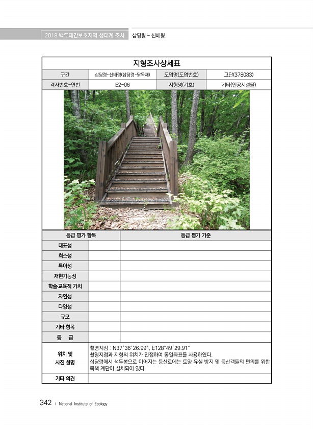 2018 백두대간보호지역 생태계 조사 삽당령 신배령 342 ? National Institute of Ecology 지형조사상세표 구간 삽당령신배령 삽당령닭목재 도엽명 도엽번호 고단 378083 격자번호-연번 E2-06 지형명 기호 기타 인공시설물 등급 평가 항목 등급 평가 기준 대표성 희소성 특이성 재현가능성 학술?교육적 가치 자연성 다양성 규모 기타 항목 등 급 위치 및 사진 설명 촬영지점 N37°36′26.99″, E128°49′29.91″ 촬영지점과 지형의 위치가 인접하여 동일좌표를 사용하였다. 삽당령에서 석두봉으로 이어지는 등산로에는 토양 유실 방지 및 등산객들의 편의를 위한 목책 계단이 설치되어 있다. 기타의견