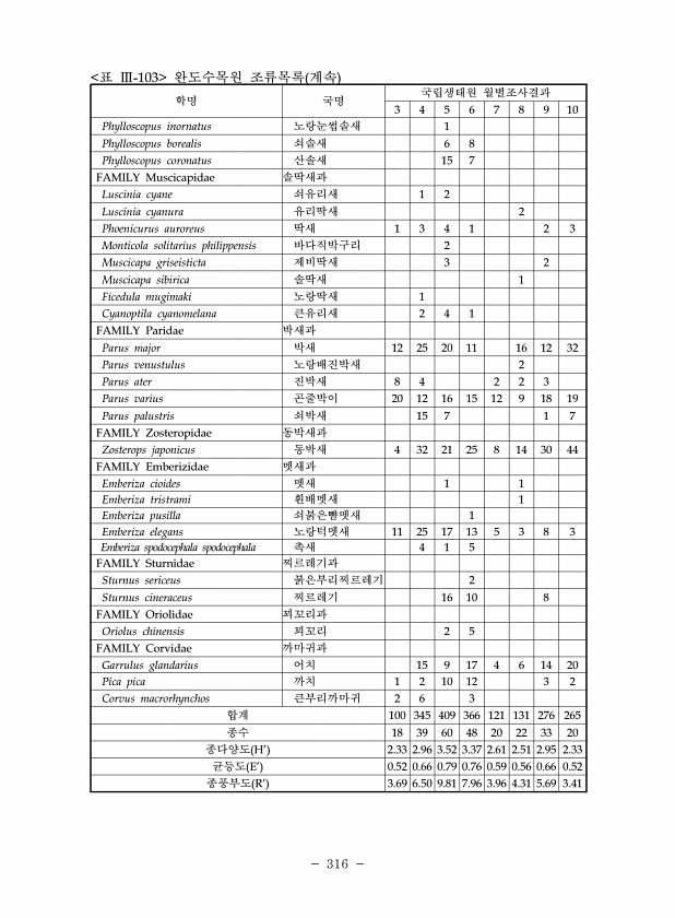 316 표 Ⅲ-103 완도수목원 조류목록 계속 학명 국명 국립생태원 월별조사결과 3 4 5 6 7 8 9 10 Phylloscopus inornatus 노랑눈썹솔새 1 Phylloscopus borealis 쇠솔새 6 8 Phylloscopus coronatus 산솔새 15 7 FAMILY Muscicapidae 솔딱새과 Luscinia cyane 쇠유리새 1 2 Luscinia cyanura 유리딱새 2 Phoenicurus auroreus 딱새 1 3 4 1 2 3 Monticola solitarius philippensis 바다직박구리 2 Muscicapa griseisticta 제비딱새 3 2 Muscicapa sibirica 솔딱새 1 Ficedula mugimaki 노랑딱새 1 Cyanoptila...